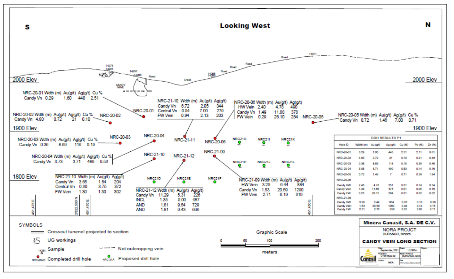 Drilling will be focused below and on strike extension to the north of drill holes NRC-21-09 and NRC-21-12 which returned the widest intercepts and highest silver and gold grades to date from the Candy vein, as detailed in the table below: